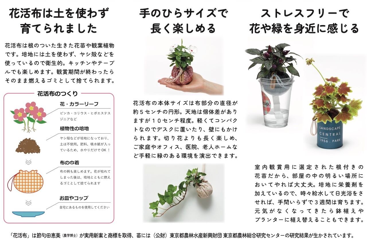 花活布(hanacup 、ハナカップ)は、生花や観葉植物を布製の巾着袋で包み、時々給水と光をあてるだけで、室内環境で長期間観賞できるようにした生きたインテリア製品です。